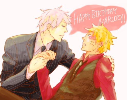 とはいっても、2年くらい前に描いてアップしそこなった絵です。カカシ先生が本気を出してキザな祝い方をすれば面白い・・・とか何とか妄想して描いたんだと思います。君の瞳に乾杯、くらいのベタな台詞を言ってナルトを口説いてほしいところです。
